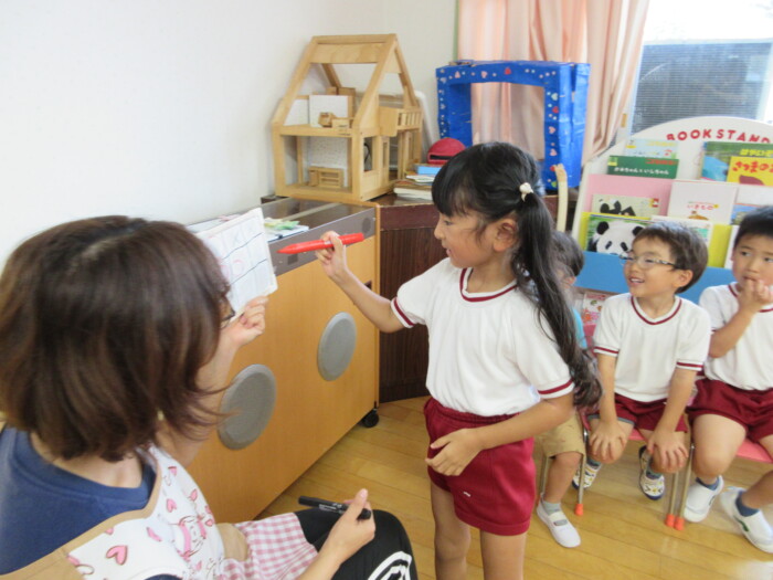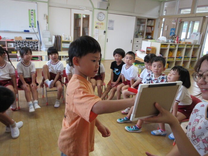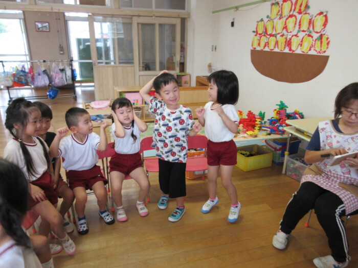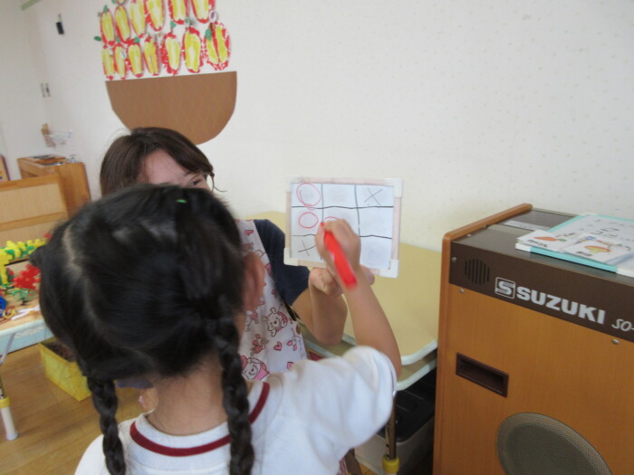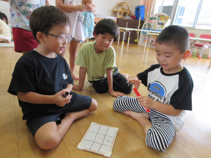 うめ4歳児 〇✕ゲームをしてみました! 2025年9月26日 59 今日の朝のお楽しみは〇✕ゲームです!今日は子ども達と先生で勝負です。簡単なようで難しい遊びで中々、勝つことが出来ずどうやったら勝てるのか考えていました。何度かした後に勝つことができて皆で「やったー!!」と大喜び、ルールを覚えて友だちとする様子もありました。