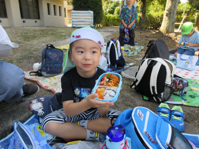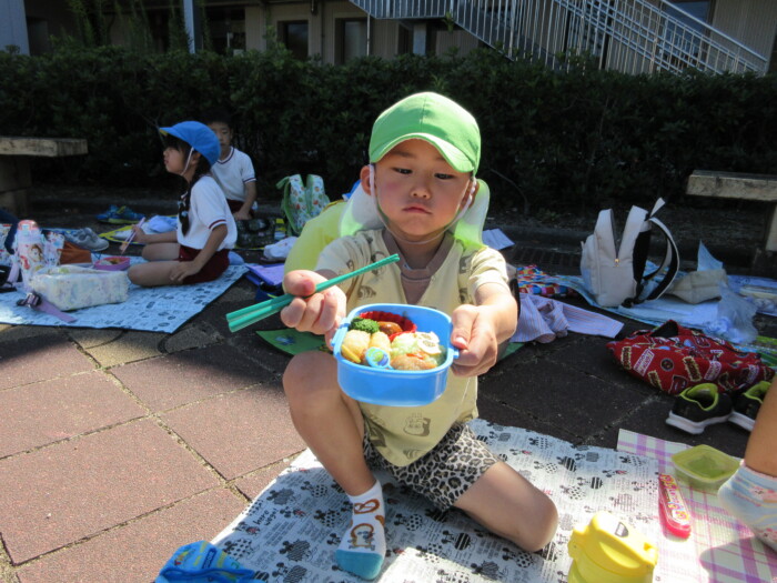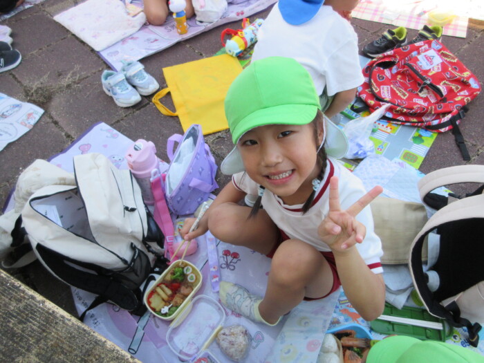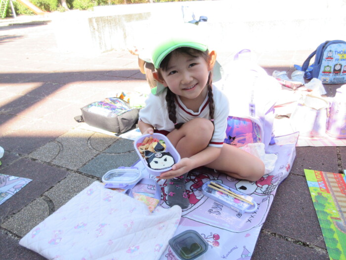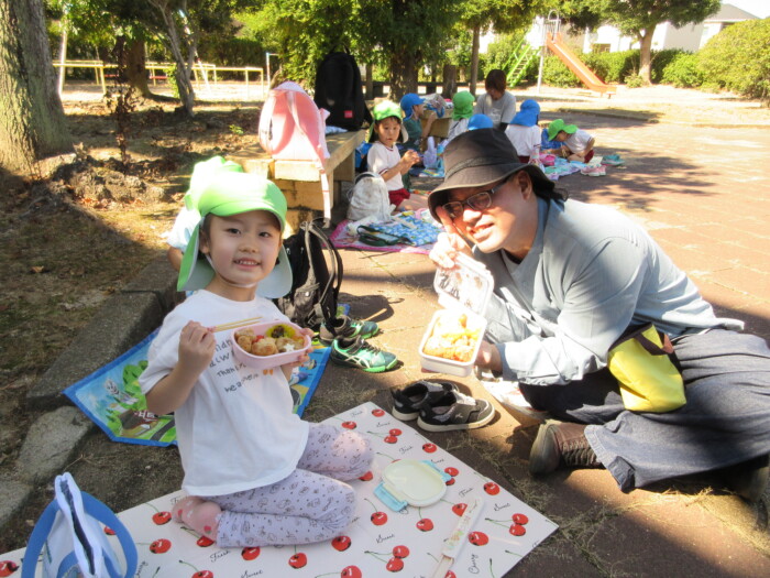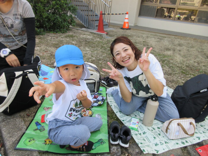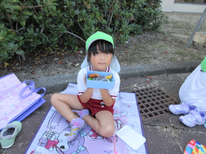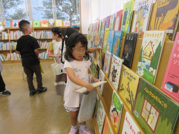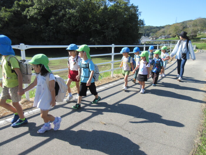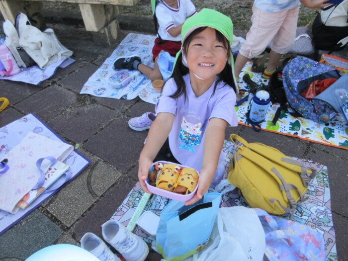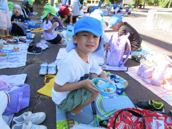 きく5歳児うめ4歳児 しっかり歩きました 2025年10月10日 144 うめ、きく組は健脚活動で図書館・公民館まで歩いていきました。道のりは長く「まだ着かない?」と言いながらも、きく組はうめ組さんをリードしながら頑張って歩いていました。図書館に着いたときは「やっと着いたね」とみんなほっとした様子。図書館では読み聞かせをしてもらったり、絵本の紹介をしてもらい好きな本を2冊選んで借りました。その後は、公民館に移動して待ちに待ったお弁当をみんなで食べました。今日はお弁当のご協力ありがとうございました。みんな「おいしいね♡」と言いながら食べていました。