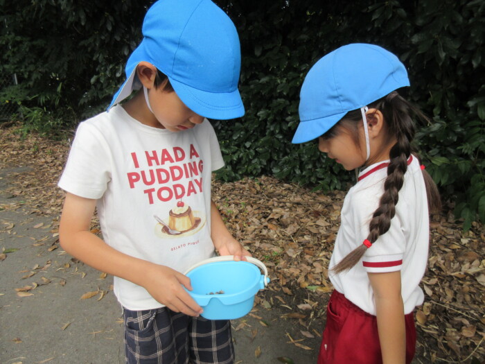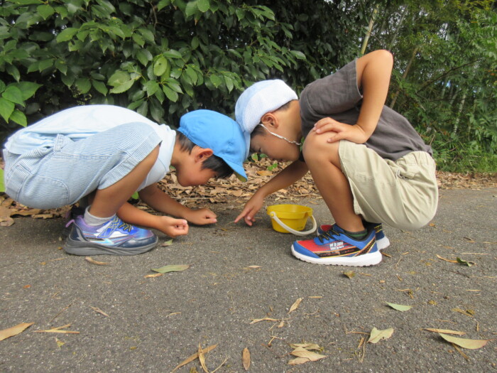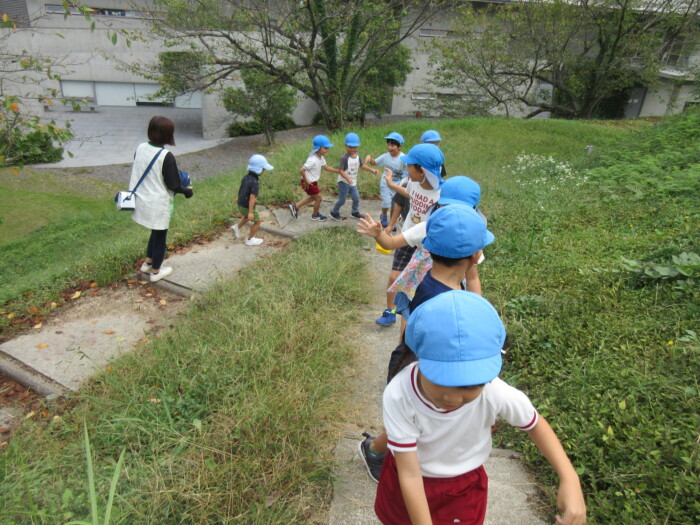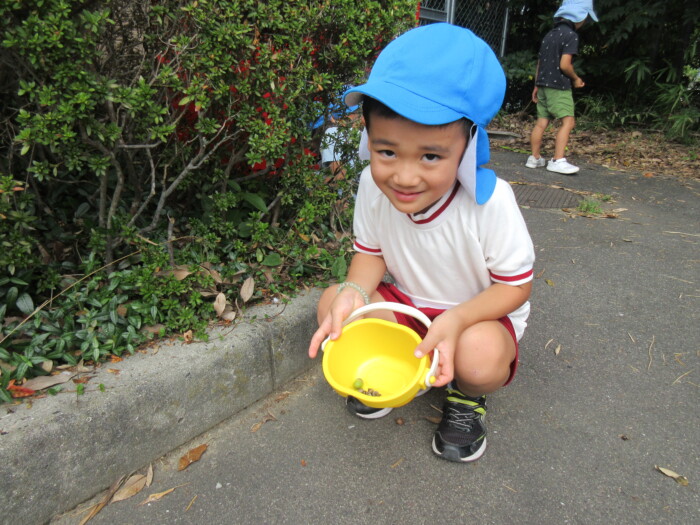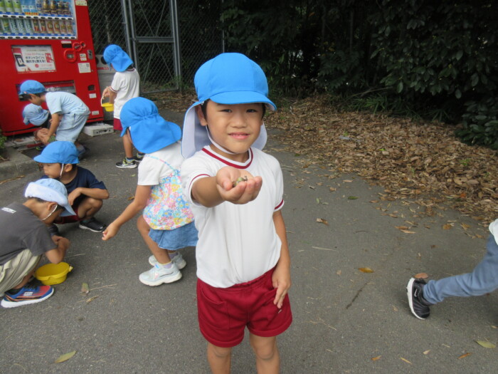 きく5歳児 どんぐりを拾いに 2025年10月15日 33 今日はIPUにどんぐりを拾いに行きました。前回は大きいどんぐりを拾いましたが、今日は小さなどんぐりを拾いました。でも、どんぐりはまだ落ちておらず…落ちていても割れている物がほとんどでした。木を見るとまだ緑で木に付いている物ばかり。「どんぐりまだだね~」と話していたら、「小さいどんぐり見つけたよ」との声。そこからみんなも一生懸命探し、赤ちゃんサイズのちいさなどんぐりを拾って帰りました。
