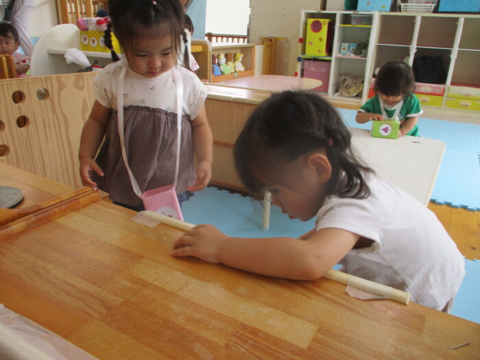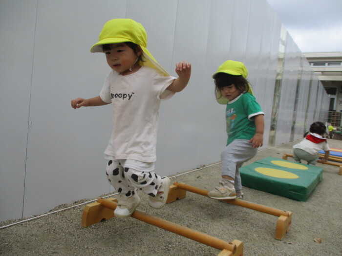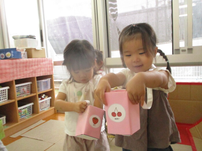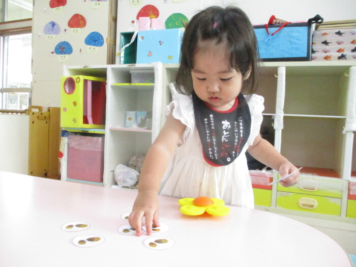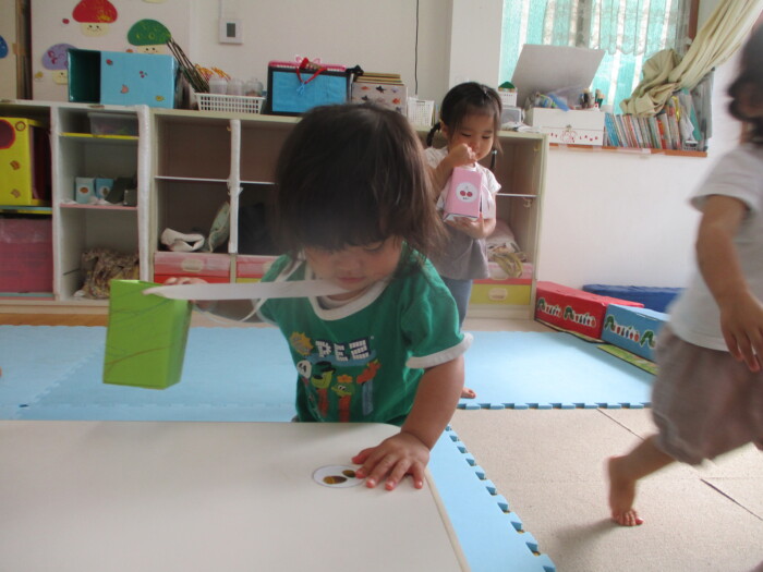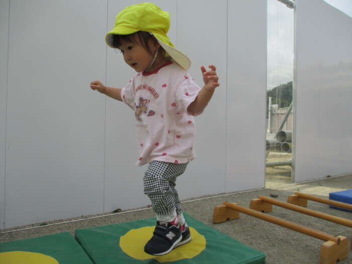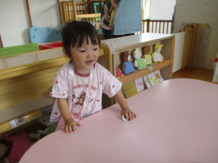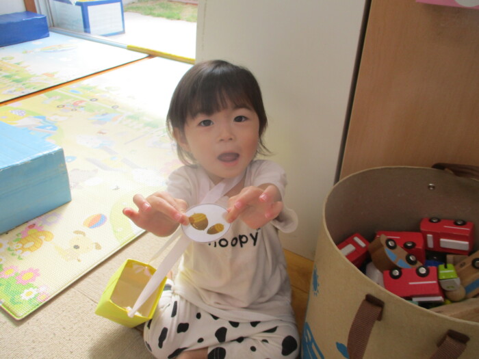 すみれ1歳児 どんぐり探したよ♪ 2025年10月14日 36 どんぐりのイラストカード探しをしました。1~10まで数えるのも上手になってきています。保育者が隠す様子が気になり時々見ながらも、小さな手で顔を覆って見ないようにも頑張っている子どもの姿が可愛いかったです♡「もーいーかい」「もーいーよ」の声で探します。カバンにたくさん集められて嬉しそうでした♫ また、本物のどんぐり観察してみようと思います。 戸外ではサーキットや散策を楽しみました☆