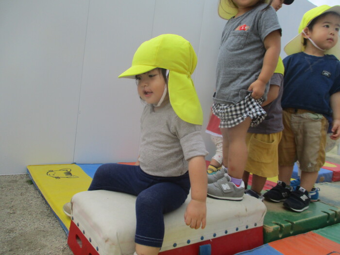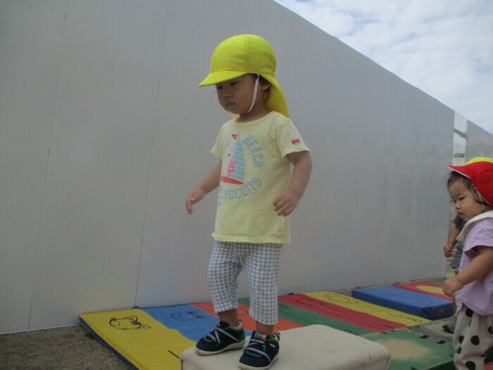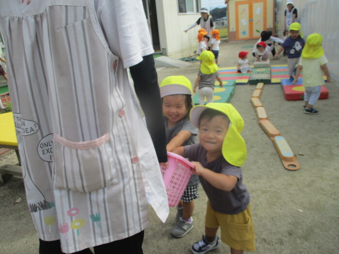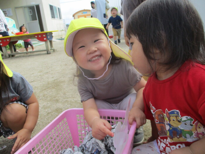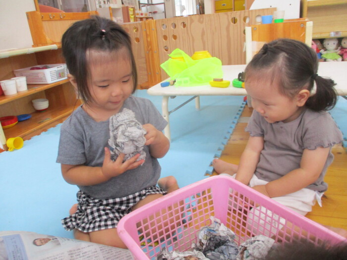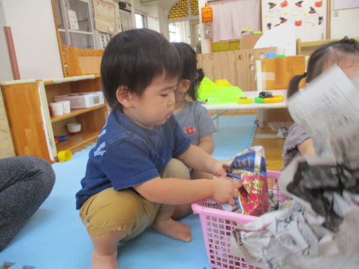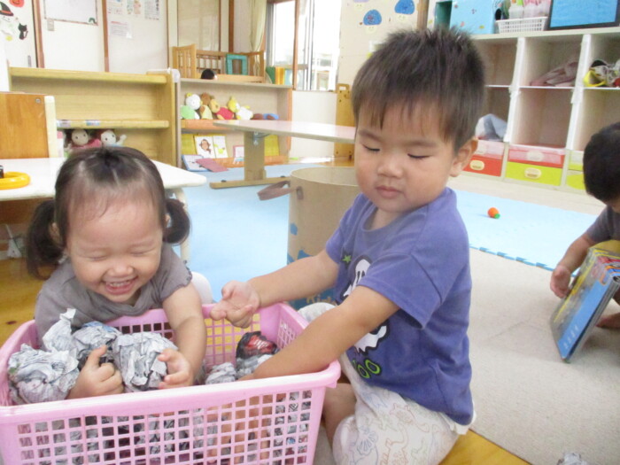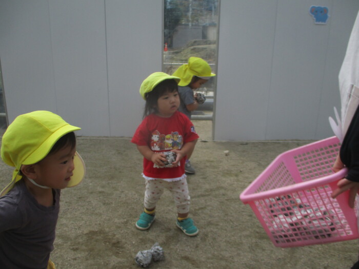 すみれ1歳児 まてまてー 2025年10月8日 67 新聞ボールを使って玉入れをしました。保育者が持つかごを追いかけて一生懸命投げいれます。「まってー」という声も聞こえました♪新聞ボールは、朝子どもたちが作ってくれましたよ!
