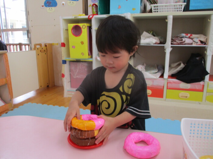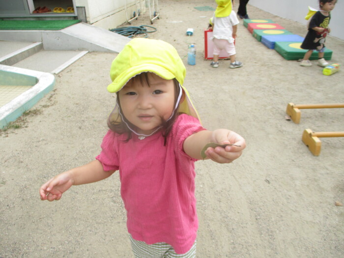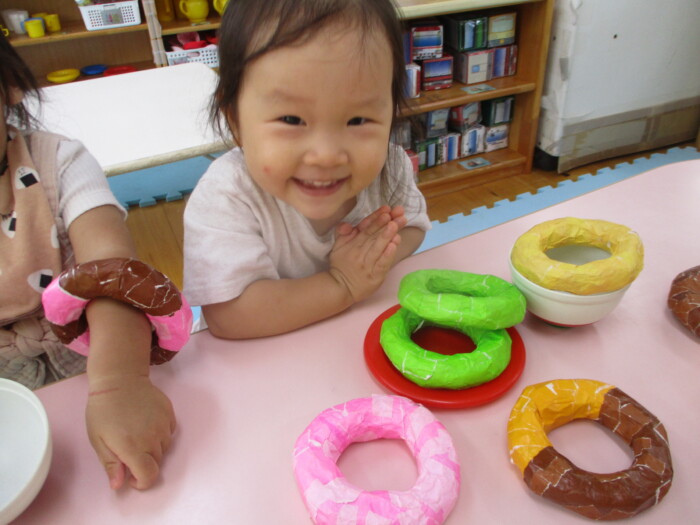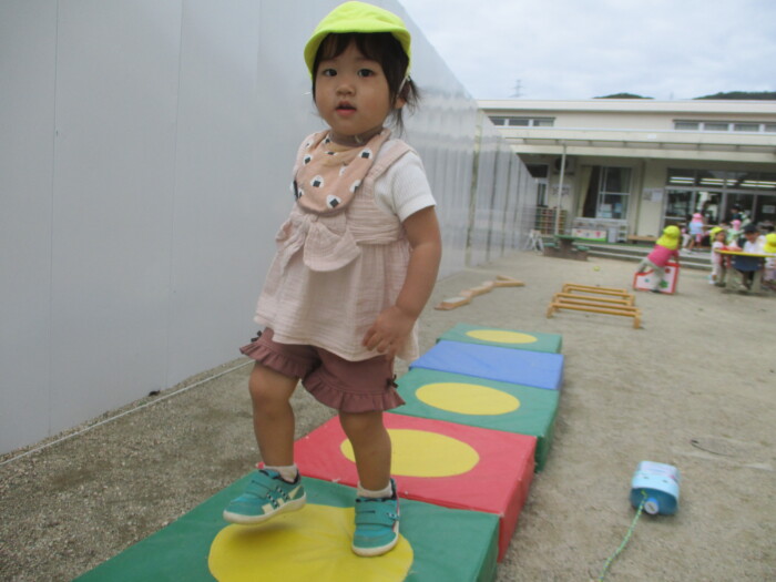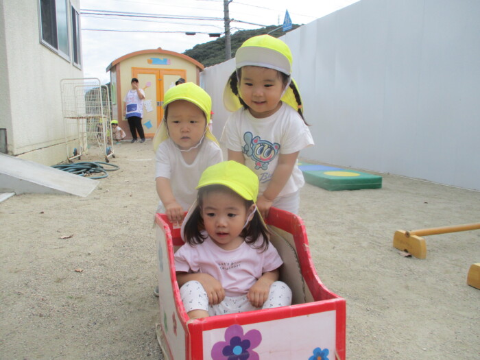 すみれ1歳児 よいしょっ☆ 2025年10月15日 32 今日も元気に遊びを楽しむすみれ組。 手押し箱にお友だちが乗って、仲良く押しています♪ 「よいしょ☆」と声をかけ合いながら頑張る姿が微笑ましいです☺