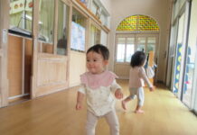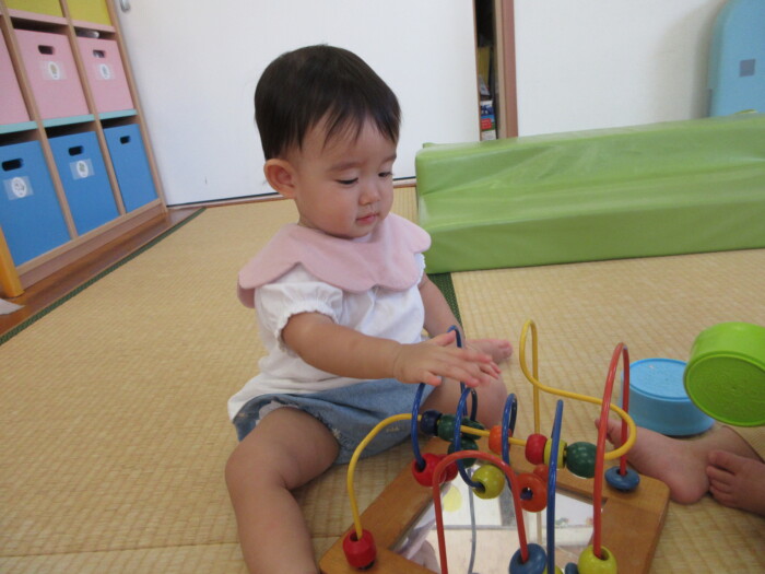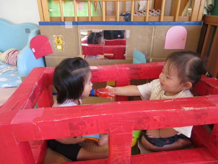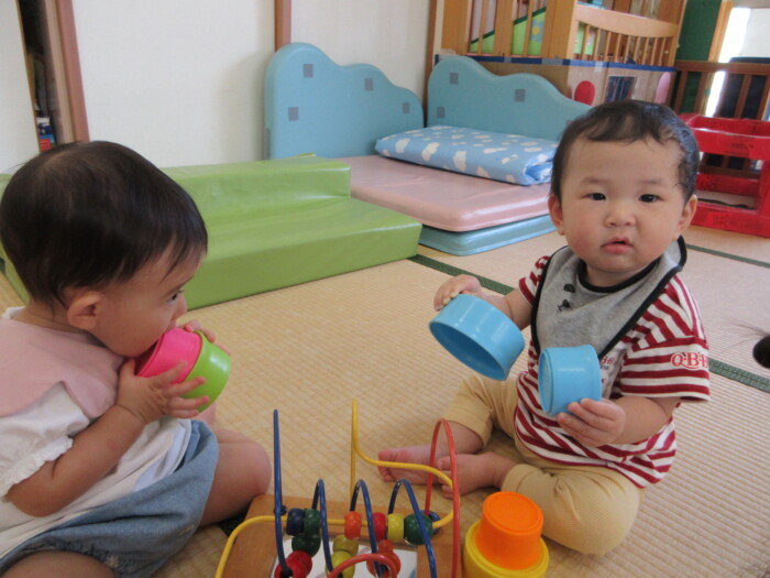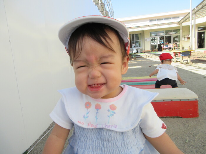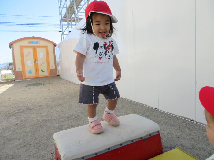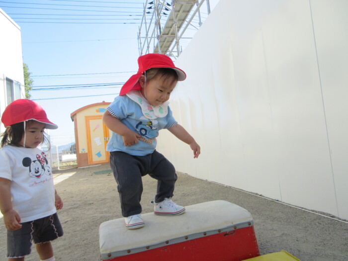 たんぽぽ0歳児 何して遊ぶ? 2025年10月17日 30 動きが活発になって自分で好きな所に動き回っています。 戸外遊びはもちろんのこと、園内散歩にも慣れ、いろいろなクラスの玩具を出して遊ぶほどに。 今日は戸外で跳び箱の上に登って降りてを繰り返す高月齢児。低月齢児も長い時間とはいきませんが、しばらく戸外遊びを楽しむことができるようになってきました。 室内に入ってからも、友だちと一緒に楽しそうです!