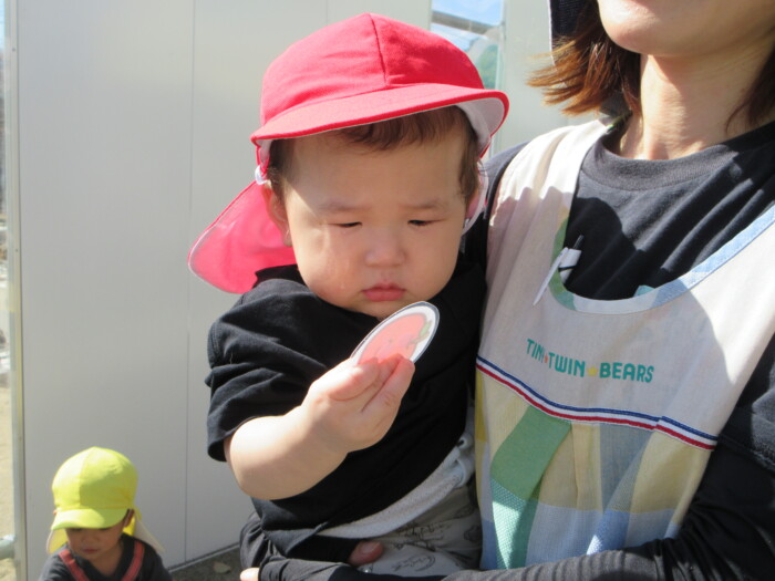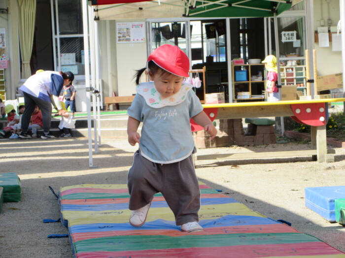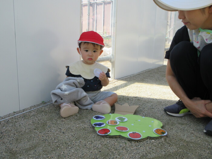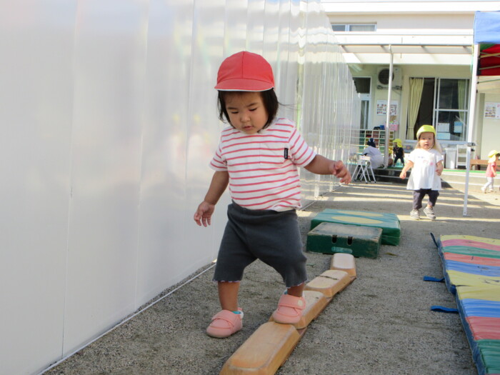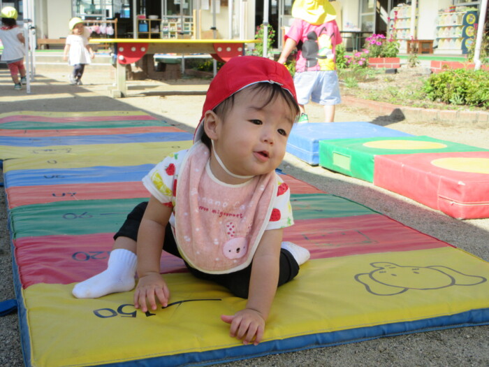 たんぽぽ0歳児 外遊び楽しいね!! 2025年10月7日 31 今日はマットや一本橋で遊んだり、すみれさんの果物カードで一緒に遊んだりしました。 戸外遊びにも慣れてきて、よく移動をして遊んでいる子どもたちです。