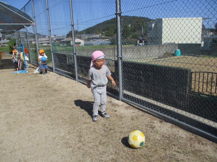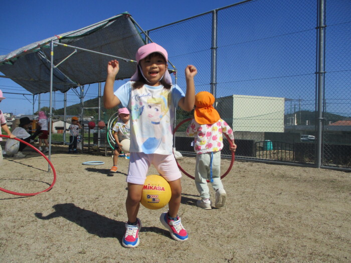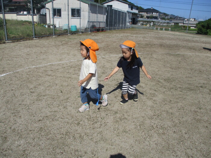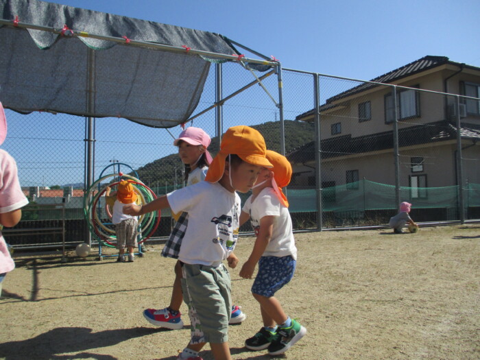 今日はさくら組・もも組で広場に行き、一緒にしっぽ取りをして遊びました。