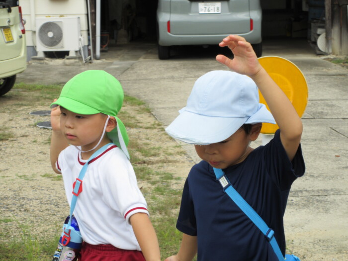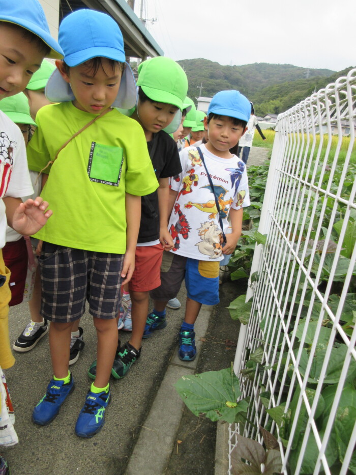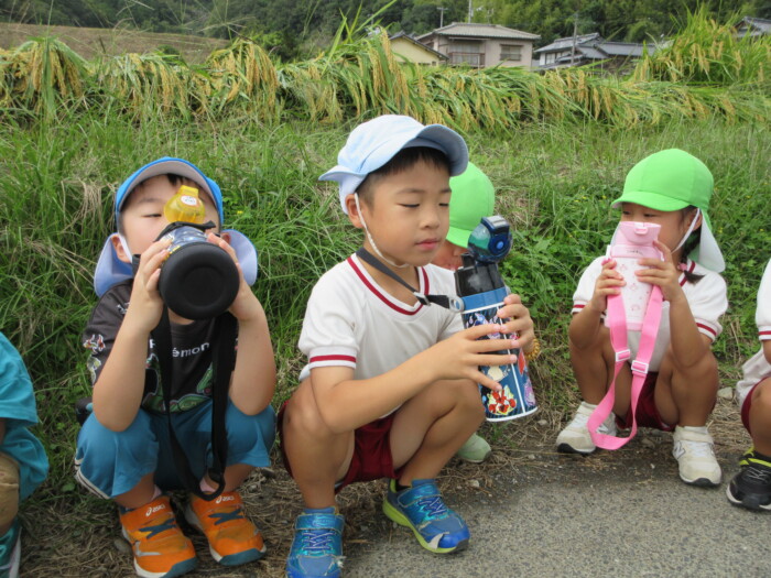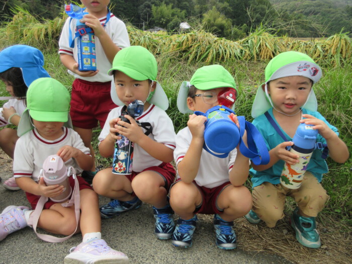 きく5歳児うめ4歳児 散歩に行きました 2025年9月26日 95 今日はうめ・きく組で散歩に行きました。少しずつ秋模様になってきて、トンボが飛んでいたりお米、コスモス、彼岸花などを見ながら散歩することが出来ました。