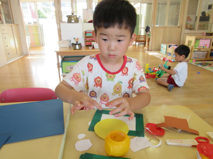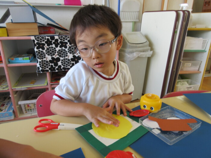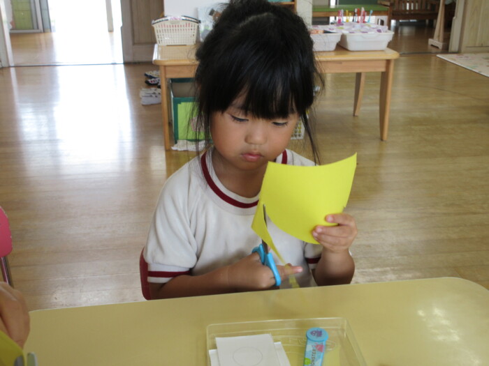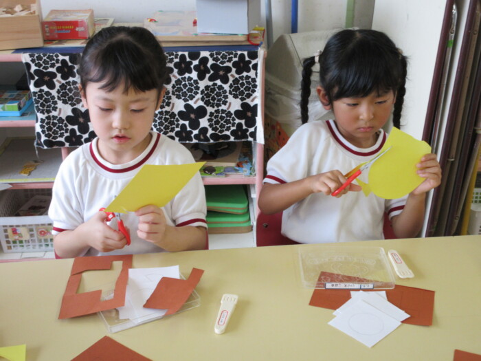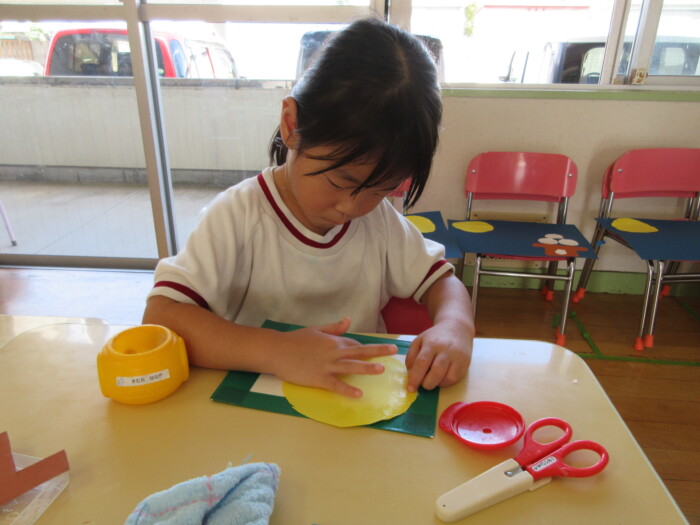うめ4歳児 月とお団子を切りました 2025年9月29日 60 十五夜にちなんで、月と団子を切って製作をしました。線の上をゆっくりと切っていましたが、上手く丸くならない時には少ししょんぼりとしてましたがとても真剣な表情の子どもたちでした。明日、うさぎを描いて完成したいと思います。