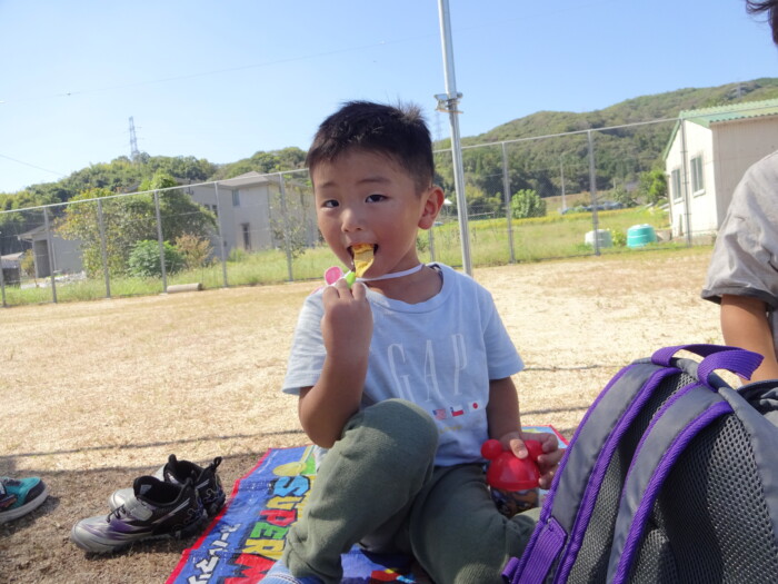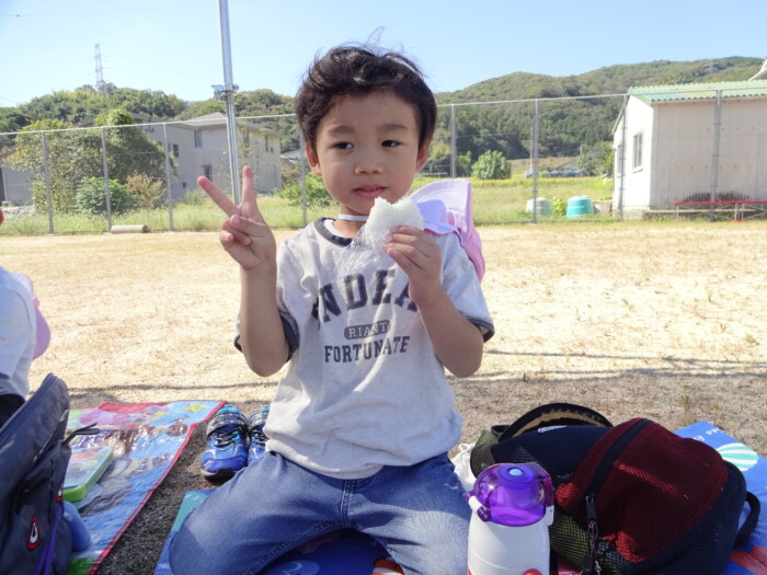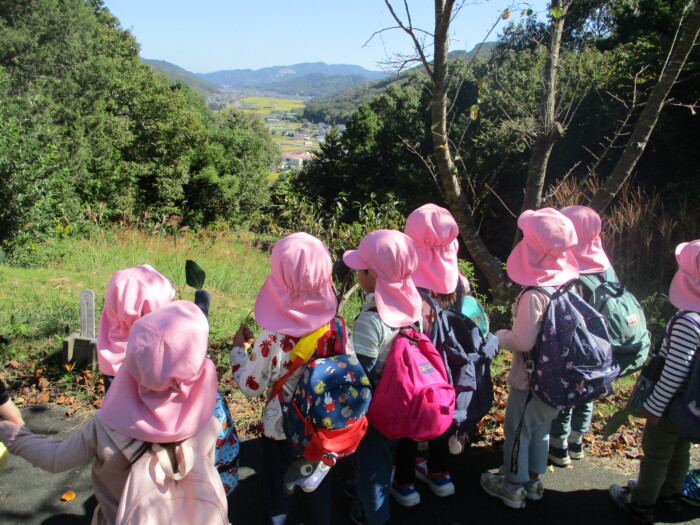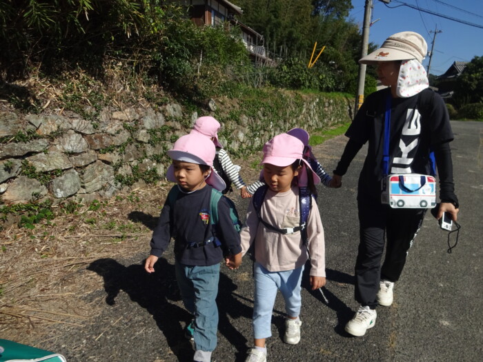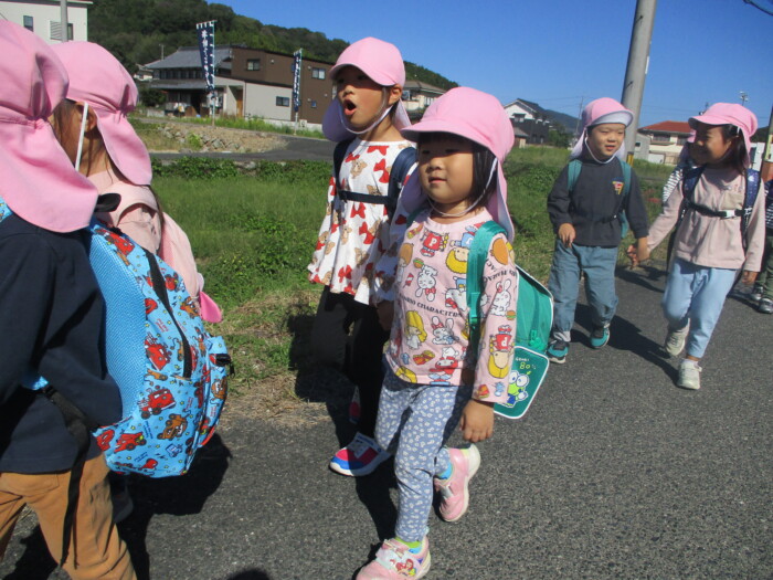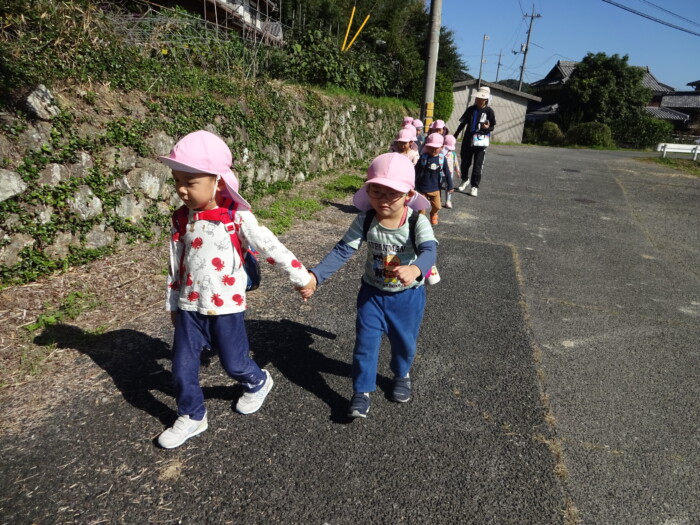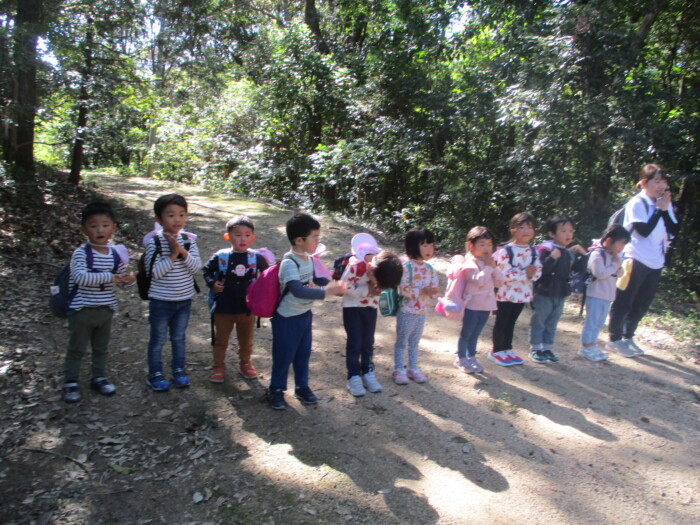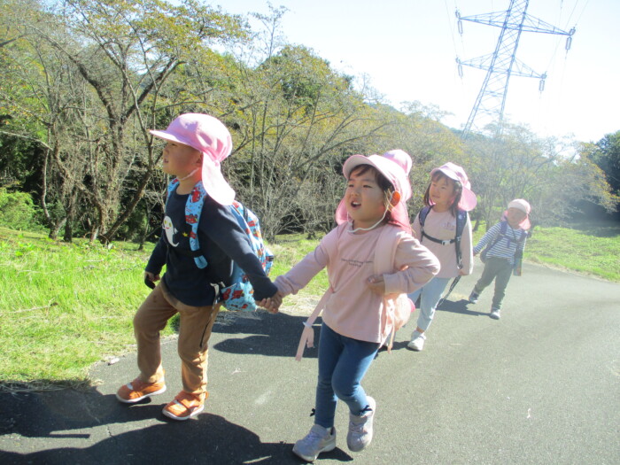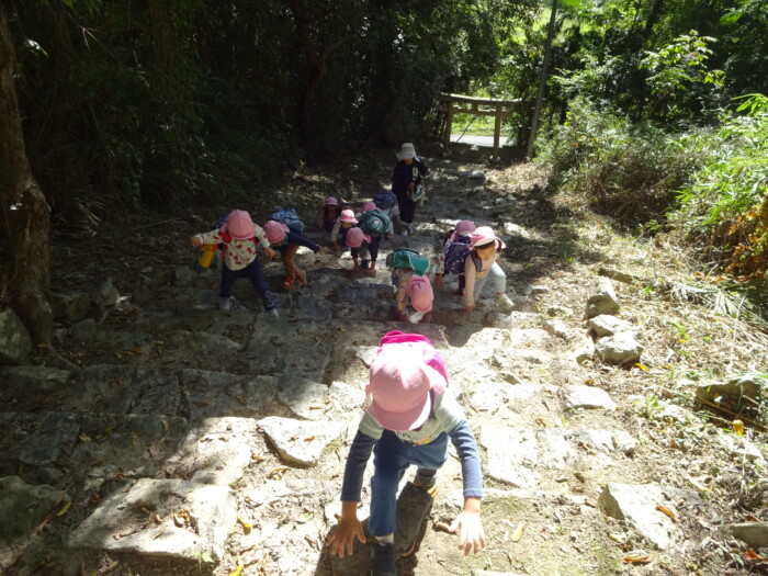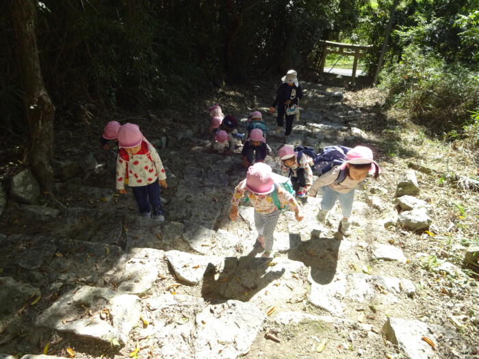 もも3歳児 素戔嗚神社まで行ってきたよ(健脚活動)♪ 2025年10月10日 63 今日は楽しみにしていた健脚活動(石階段を登る日)。 行きながら「さんぽ」の歌をうたって元気に歩いていたので、帰りに疲れないかな?と心配をしていましたが、心配とはうらはらに園に帰ってくるまでとても元気でした。 元気に出発! さぁ!これから石階段を上がるぞ~。 みんなでお参りしたよ♪ ちょっと休憩して帰りまぁす。 たくさん歩いてお腹がすいたね。「いっただっきまーす‼」