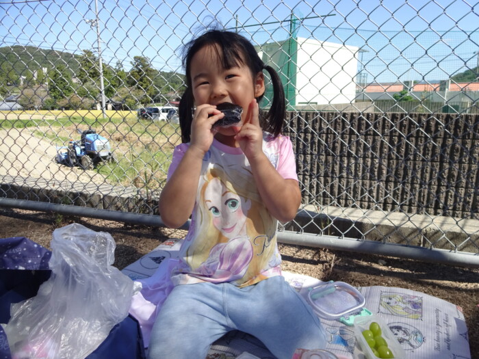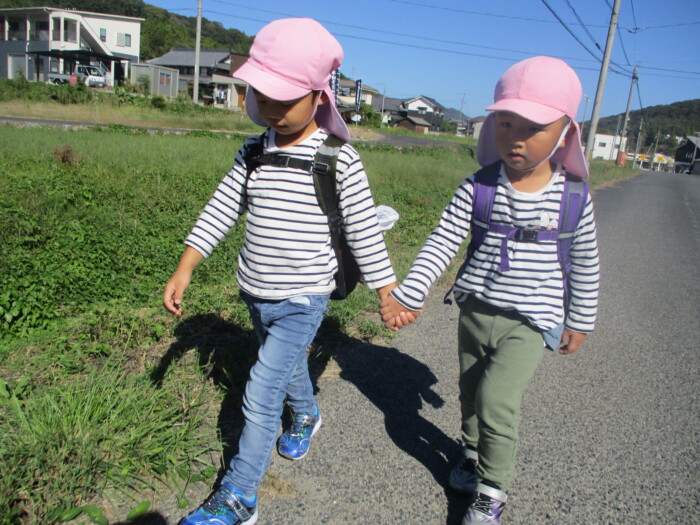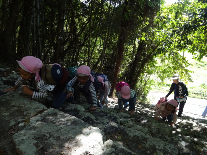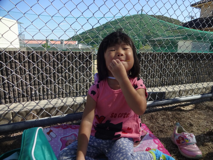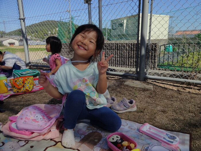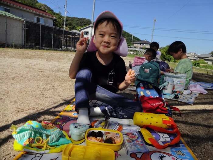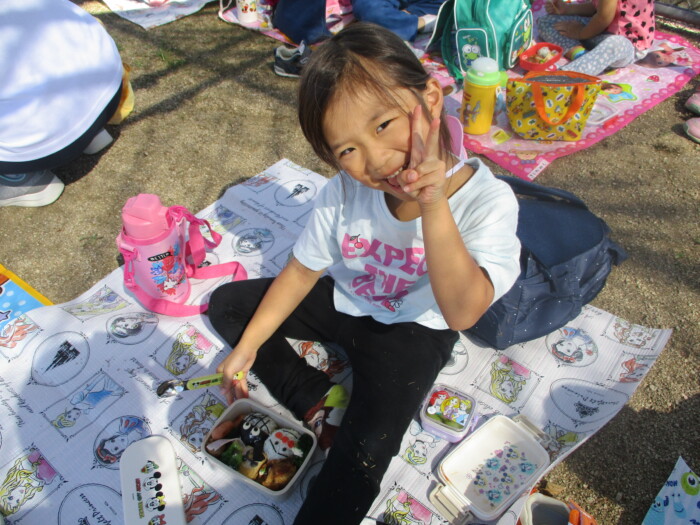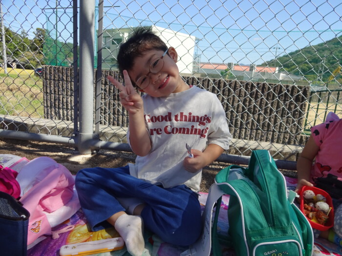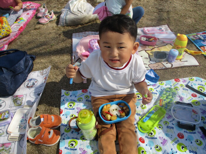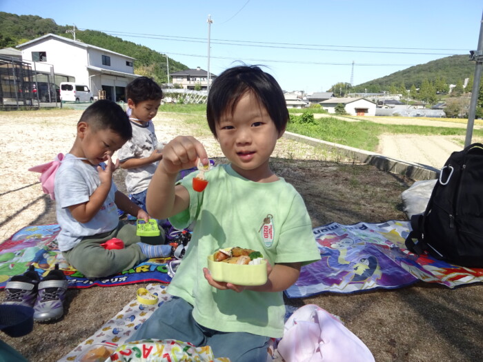 もも3歳児 素戔嗚神社まで行ってきたよ(健脚活動)♪ 2025年10月10日 63 今日は楽しみにしていた健脚活動(石階段を登る日)。 行きながら「さんぽ」の歌をうたって元気に歩いていたので、帰りに疲れないかな?と心配をしていましたが、心配とはうらはらに園に帰ってくるまでとても元気でした。 元気に出発! さぁ!これから石階段を上がるぞ~。 みんなでお参りしたよ♪ ちょっと休憩して帰りまぁす。 たくさん歩いてお腹がすいたね。「いっただっきまーす‼」