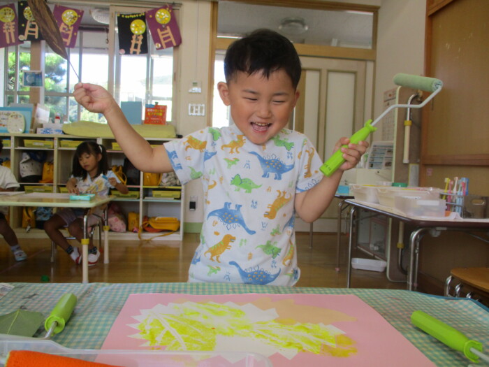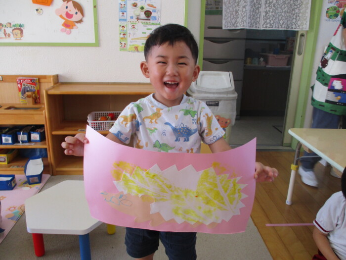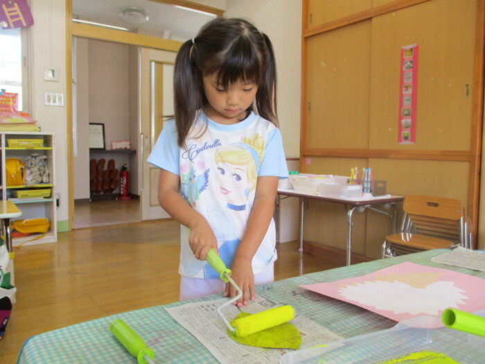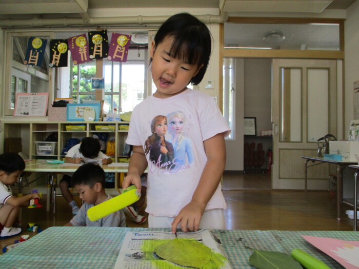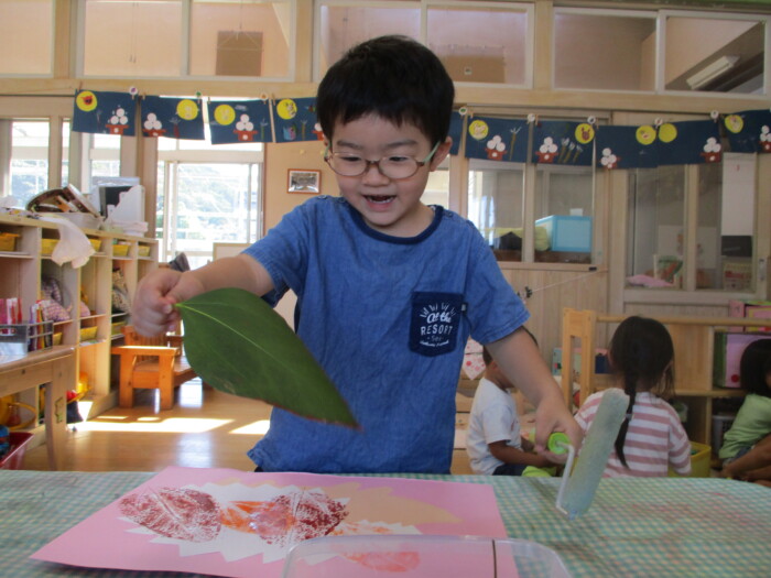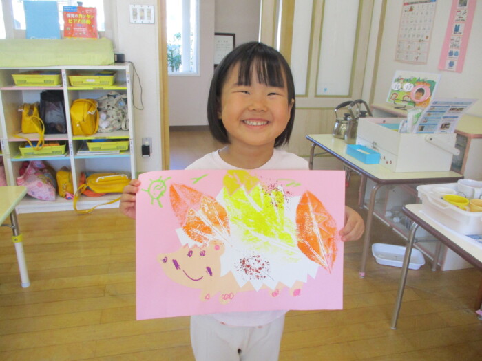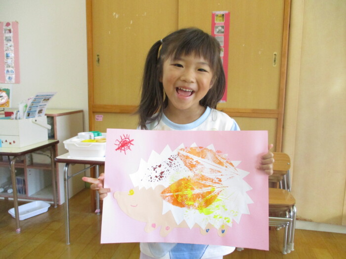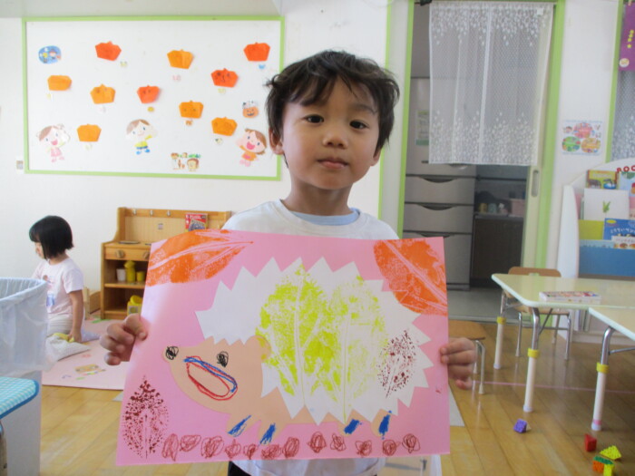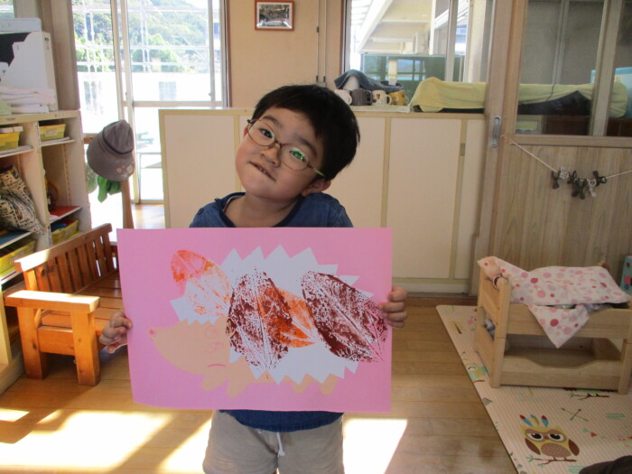 もも3歳児 葉っぱスタンプ② 2025年10月17日 22 今日は葉っぱ製作2日目です。 昨日スタンプをしていた友だちを見てやり方を覚えていたので、「やりたい!」気持ちがあふれ出ていました。 葉っぱを取った時にできている模様に「わぁ~キレイ‼」の連続でした。 今日葉っぱスタンプをした子どもたちの中に、シンプルなハリネズミやおしゃれなハリネズミがしました♪ またかわいいハリネズミを見てください。