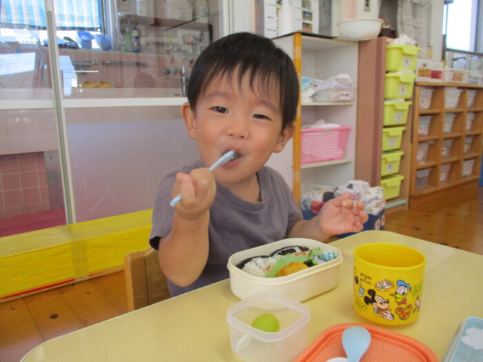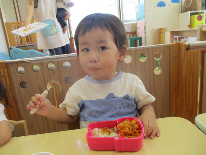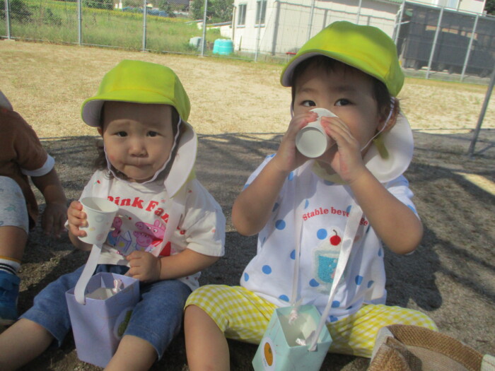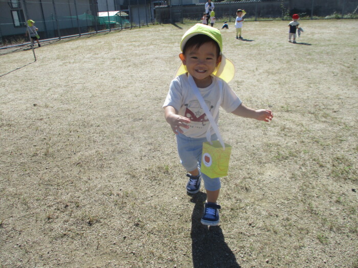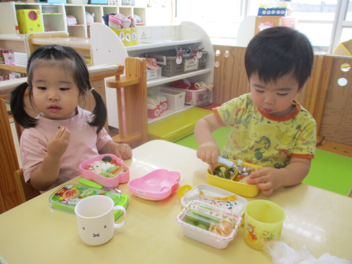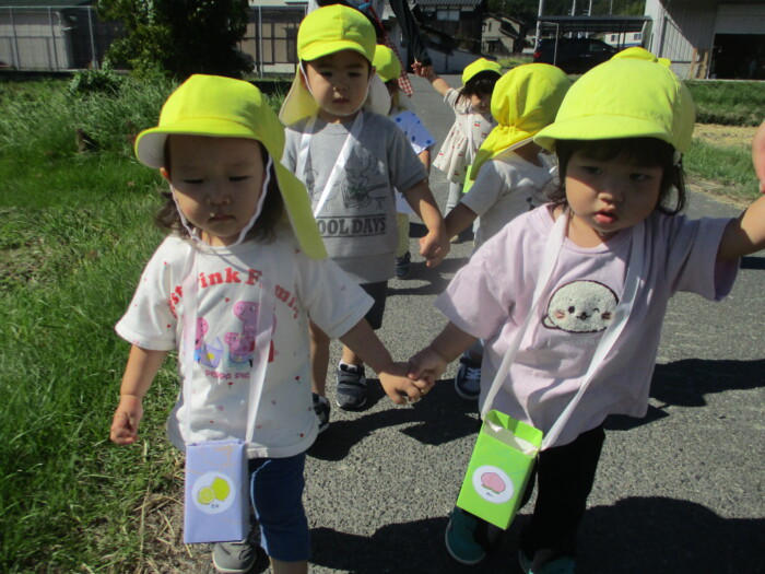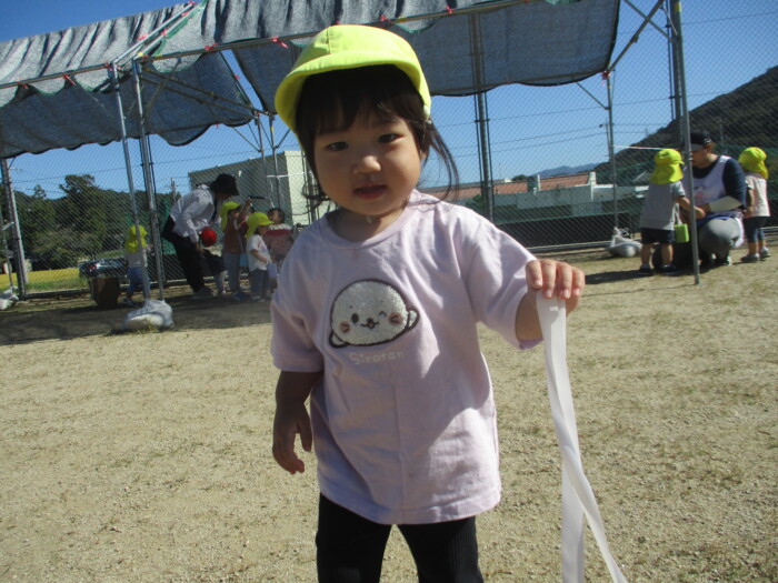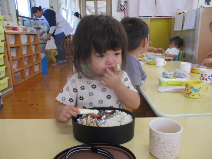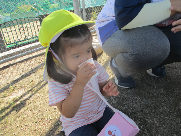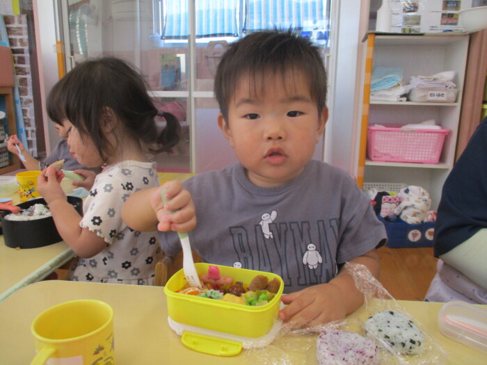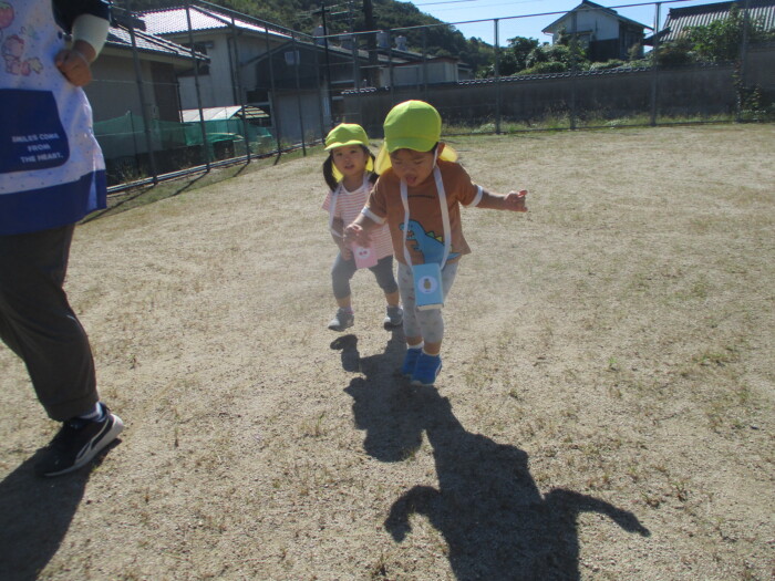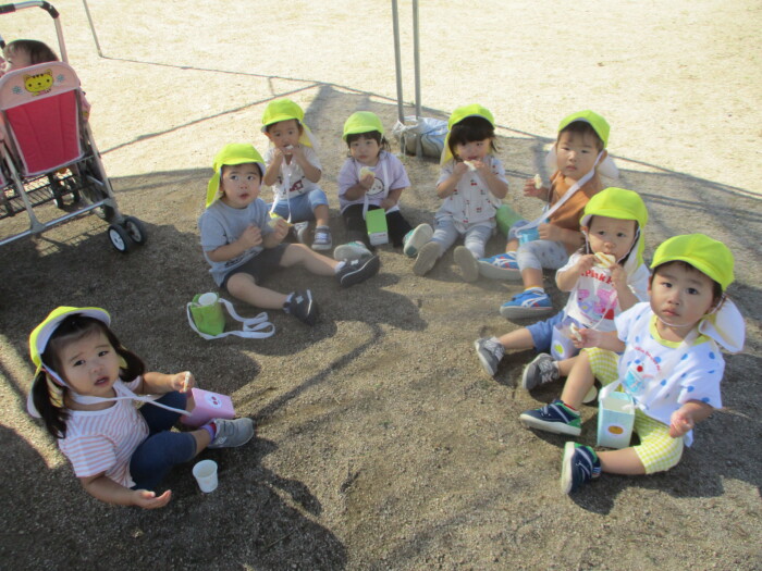 すみれ1歳児 1・2、1・2♫ 2025年10月10日 96 健脚活動がありました。 広場まで手をつないで「1・2、1・2♫」と元気よく歩いていました。 ちょっと一休みして・・・みんなで遊びました♪ みんなのお楽しみ お弁当タイム♪ 「おいし~♡」とペロリでした!